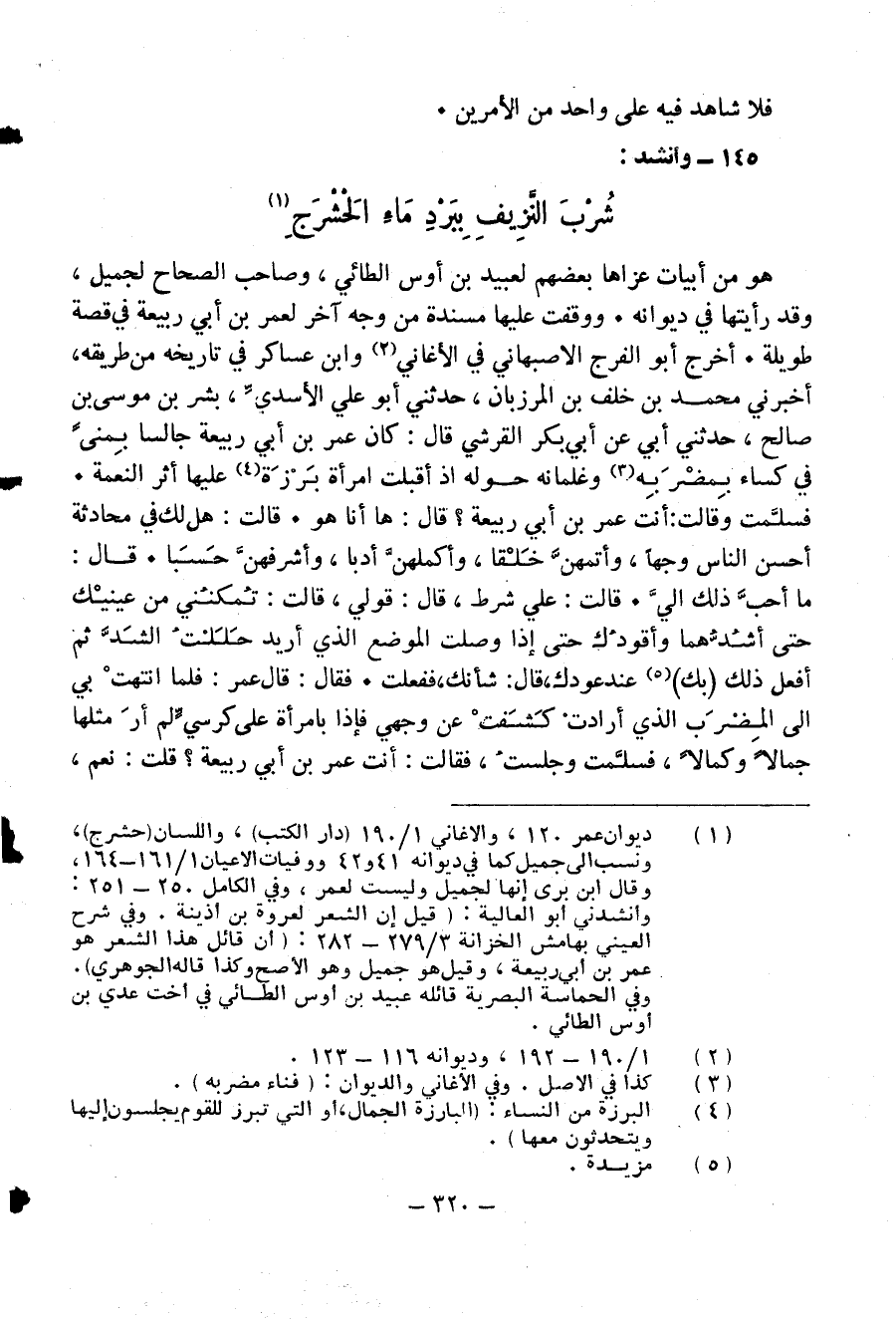 (¬1) ديوان عمر 120، والاغاني 1/ 190 (دار الكتب)، واللسان (حشرج)، ونسب الى جميل كما في ديوانه 41 و 42 ووفيات الاعيان 1/ 161 - 164، وقال ابن برى إنها لجميل وليست لعمر، وفي الكامل 350 - 251: