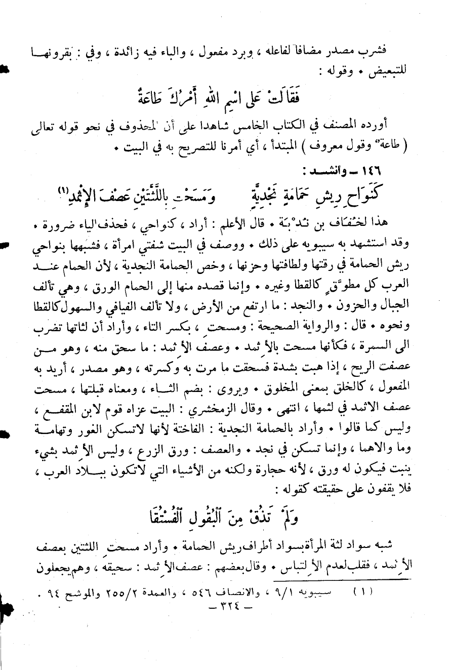 وقد استشهد به سيبويه على ذلك. ووصف في البيت شفتي امرأة، فشبهها بنواحي ريش الحمامة في رقتها ولطافتها وحزنها، وخص الحمامة النجدية، لأن الحمام عند العرب كل مطوّق كالقطا وغيره. وإنما قصده منها إلى الحمام الورق، وهي تألف الجبال والحزون. والنجد: ما ارتفع من الأرض، ولا تألف الفيافي والسهول كالقطا ونحوه. قال: والرواية الصحيحة: ومسحت، بكسر التاء، وأراد أن لثاتها تضرب الى السمرة، فكأنها مسحت بالأثمد. وعصف الأثمد: ما سحق منه، وهو من عصفت الريح، إذا هبت بشدة فسحقت ما مرت به وكسرته، وهو مصدر، أريد به المفعول، كالخلق بمعنى المخلوق. ويروى: بضم الثاء، ومعناه قبلتها، مسحت عصف الاثمد في لثمها، انتهى. وقال الزمخشري: البيت عزاه قوم لابن المقفع، وليس كما قالوا. وأراد بالحمامة النجدية: الفاختة لأنها لا تسكن الغور وتهامة وما والاهما، وإنما تسكن في نجد. والعصف: ورق الزرع، وليس الأثمد بشيء ينبت فيكون له ورق، لأنه حجارة ولكنه من الأشياء التي لا تكون ببلاد العرب، فلا يقفون على حقيقته كقوله: