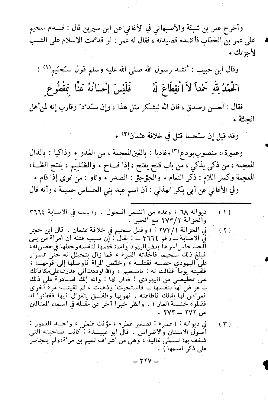 وأخرج عمر بن شبّة والأصبهاني في الأغاني عن ابن سيرين قال: قدم سحيم على عمر بن الخطاب فأنشده قصيدته، فقال له عمر: لو قدّمت الاسلام على الشيب لأجزتك.