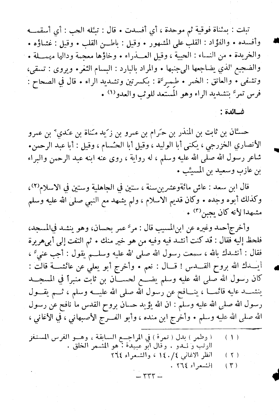 وأخرج أحمد وغيره عن ابن المسيب قال: مرّ عمر بحسان، وهو ينشد في المسجد، فلحظ إليه فقال: قد كنت أنشد فيه وفيه من هو خير منك. ثم التفت إلى أبى هريرة فقال: أنشدك بالله، سمعت رسول الله صلّى الله عليه وسلّم يقول: أجب عنيّ، أيدك الله بروح القدس! قال: نعم. وأخرج أبو يعلي عن عائشة قالت: