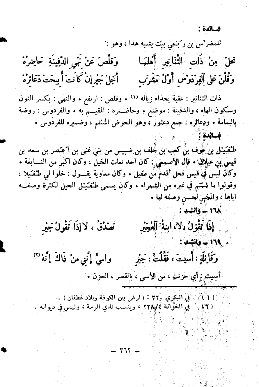ذات التنانير: عقبة بحذاء زباله (¬1). وقلص: ارتفع. والنهى: بكسر النون وسكون الهاء، والدفينة: موضع. وحاضره: المقيم به. والفردوس: روضة باليمامة. ودعاثره: جمع دعثور، وهو الحوض المتثلم، وضميره للفردوس.