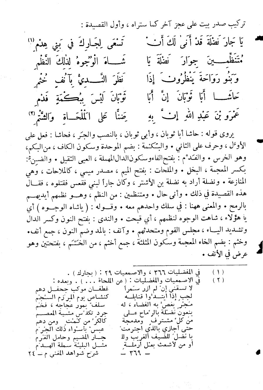 بكسر المعجمة، البخل. والملحات: بفتح الميم، مصدر ميمي، كالملاحات، وهي المنازعة. ونضلة أراد به نضلة بن الأشتر، وكان جارا لبني فقعس فقتلوه، فقال هذه القصيدة في ذلك. وأنى حال. ومتنظمين: من النظم، وهو نظمهم أيديهم بالرمح. والمعنى ههنا: في سلك واحدهم معه. وقوله: (يا شاه الوجوه) أي يا هؤلاء، شاهت الوجوه لنظمهم، أي قبحت. والندى: بفتح النون وكسر الدال وتشديد الياء، مجلس القوم ومتحدثهم. وآنف: بالمد وضم النون، جمع أنف.