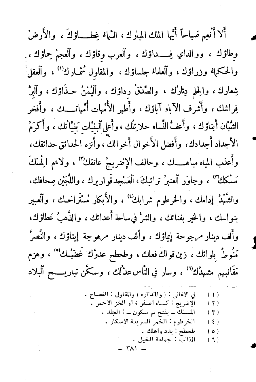 ألا أنعم صباحا أيّها الملك المبارك، السّماء غطاؤك، والأرض وطاؤك، ووالداي فداؤك، والعرب وقاؤك، والعجم حماؤك، والحكماء وزراؤك، والعلماء جلساؤك، والمقاول سمّارك (¬1)، والعقل شعارك، والحلم دثارك، والصّدق رداؤك، واليمن حذاؤك، والبرّ فراشك، وأشرف الآباء آباؤك، وأطهر الأمّهات أمّهاتك، وأفخر الشّبّان