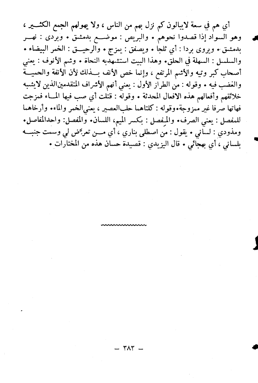 والسلسل: السهلة في الحلق. وهذا البيت استشهد به النحاة. وشم الأنوف: يعني أصحاب كبر وتيه والأشم المرتفع، وإنما خص الأنف بذلك لأن الأنفة والحمية والغضب فيه. وقوله: من الطراز الأول: يعني أنهم الأشراف المتقدمين الذين لا يشبه خلائقهم وأفعالهم هذه الافعال المحدثة. وقوله: قتلت أي صب فيها الماء فمزجت فهاتها صرفا غير ممزوجة. وقوله: كلتاهما حلب العصير، يعني الخمر والماء. وأرخاهما للمفصل: يعني الصرف. والمفصل: بكسر الميم، اللسان. والمفصل: واحد المفاصل.