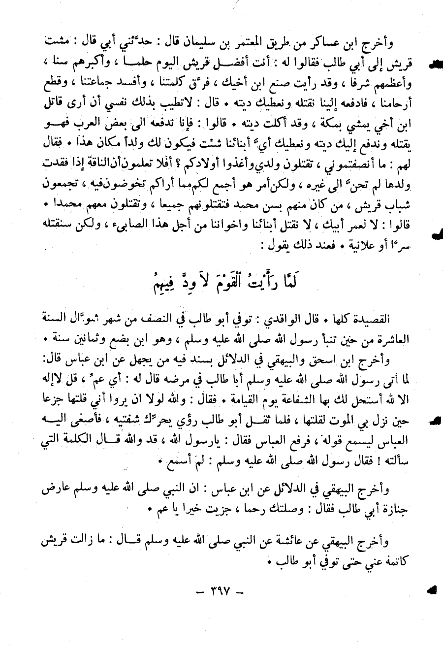 وأخرج ابن عساكر من طريق المعتمر بن سليمان قال: حدّثني أبي قال: مشت قريش إلى أبي طالب فقالوا له: أنت أفضل قريش اليوم حلما، وأكبرهم سنا، وأعظمهم شرفا، وقد رأيت صنع ابن أخيك، فرّق كلمتنا، وأفسد جماعتنا، وقطع أرحامنا، فادفعه إلينا نقتله ونعطيك ديته. قال: لا تطيب بذلك نفسي أن أرى قاتل ابن أخي يمشي بمكة، وقد أكلت ديته. قالوا: فإنا ندفعه الى بعض العرب فهو يقتله وندفع إليك ديته ونعطيك أيّ أبنائنا شئت فيكون لك ولدا مكان هذا. فقال لهم: ما أنصفتموني، تقتلون ولدي وأغذوا أولادكم؟ أفلا تعلمون أن الناقة إذا فقدت ولدها لم تحنّ الى غيره، ولكن أمر هو أجمع لكم مما أراكم تخوضون فيه، تجمعون شباب قريش، من كان منهم بسن محمد فتقتلونهم جميعا، وتقتلون معهم محمدا.