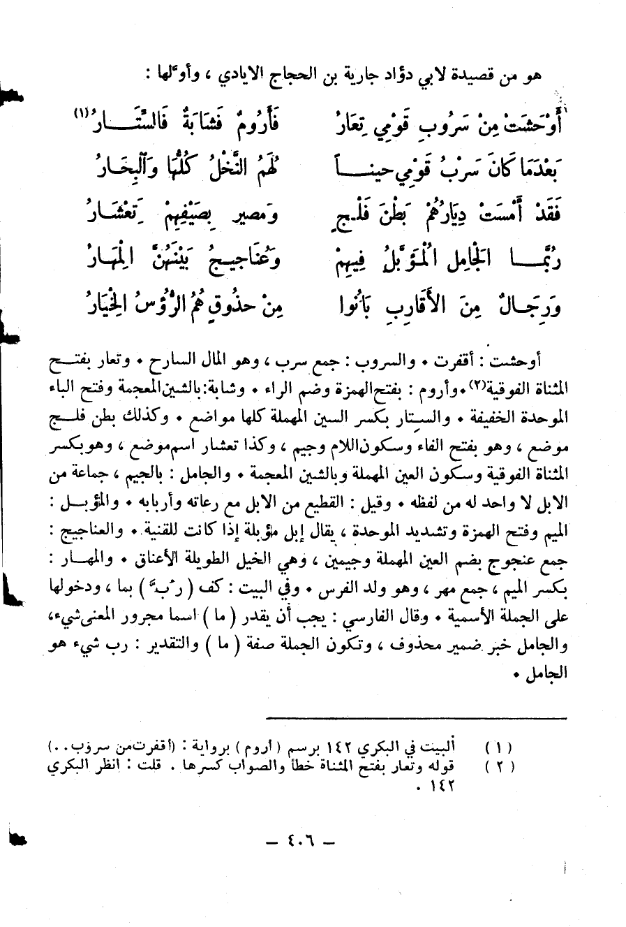 أوحشت: أقفرت. والسروب: جمع سرب، وهو المال السارح. وتعار بفتح المثناة الفوقية (¬2). وأروم: بفتح الهمزة وضم الراء. وشابة: بالشين المعجمة وفتح الباء الموحدة الخفيفة. والستار بكسر السين المهملة كلها مواضع. وكذلك بطن فلج موضع، وهو بفتح الفاء وسكون اللام وجيم، وكذا تعشار اسم موضع، وهو بكسر المثناة الفوقية وسكون العين المهملة وبالشين المعجمة. والجامل: بالجيم، جماعة من الابل لا واحد له من لفظه. وقيل: القطيع من الابل مع رعاته وأربابه. والمؤبل: