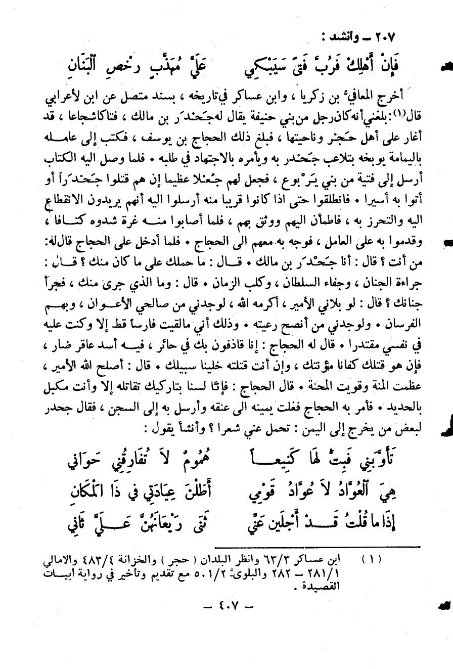 (¬1) ابن عساكر 3/ 63 وانظر البلدان (حجر) والخزانة 4/ 483 والامالي 1/ 281 - 282 والبلوىّ 2/ 501 مع تقديم وتأخير في رواية أبيات القصيدة.