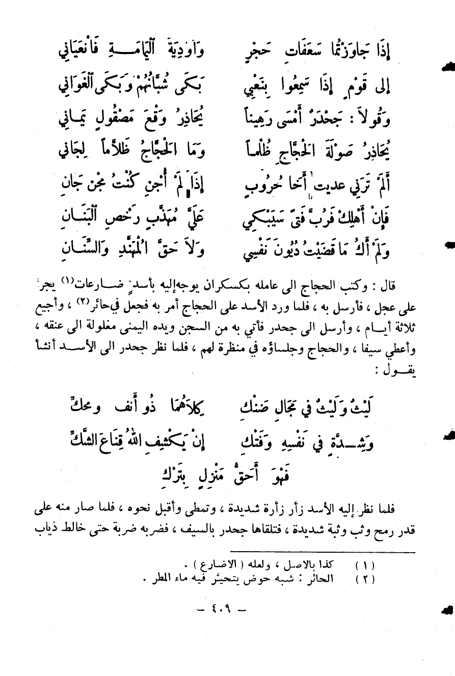 على الحجاج أمر به فجعل في حائر (¬2)، وأجيع ثلاثة أيام، وأرسل الى جحدر فأتي به من السجن ويده اليمنى مغلولة الى عنقه، وأعطي سيفا، والحجاج وجلساؤه في منظرة لهم، فلما نظر جحدر الى الأسد أنشأ يقول: