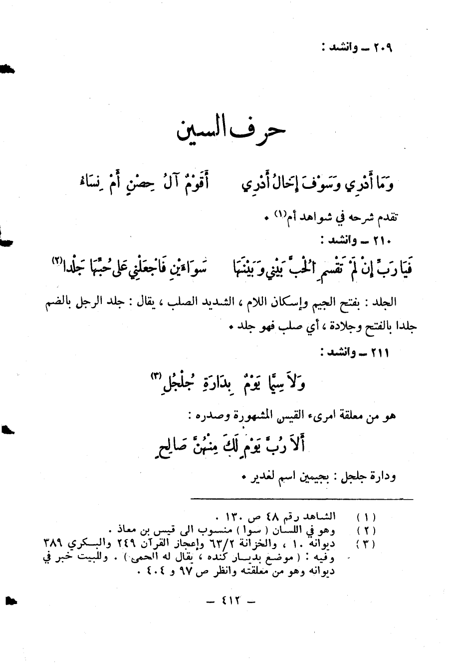 (¬3) ديوانه 10، والخزانة 2/ 63 وإعجاز القرآن 249 والبكري 389 وفيه: (موضع بديار كنده، يقال له الحمى). وللبيت خبر في ديوانه وهو من معلقته وانظر ص 97 و 404.