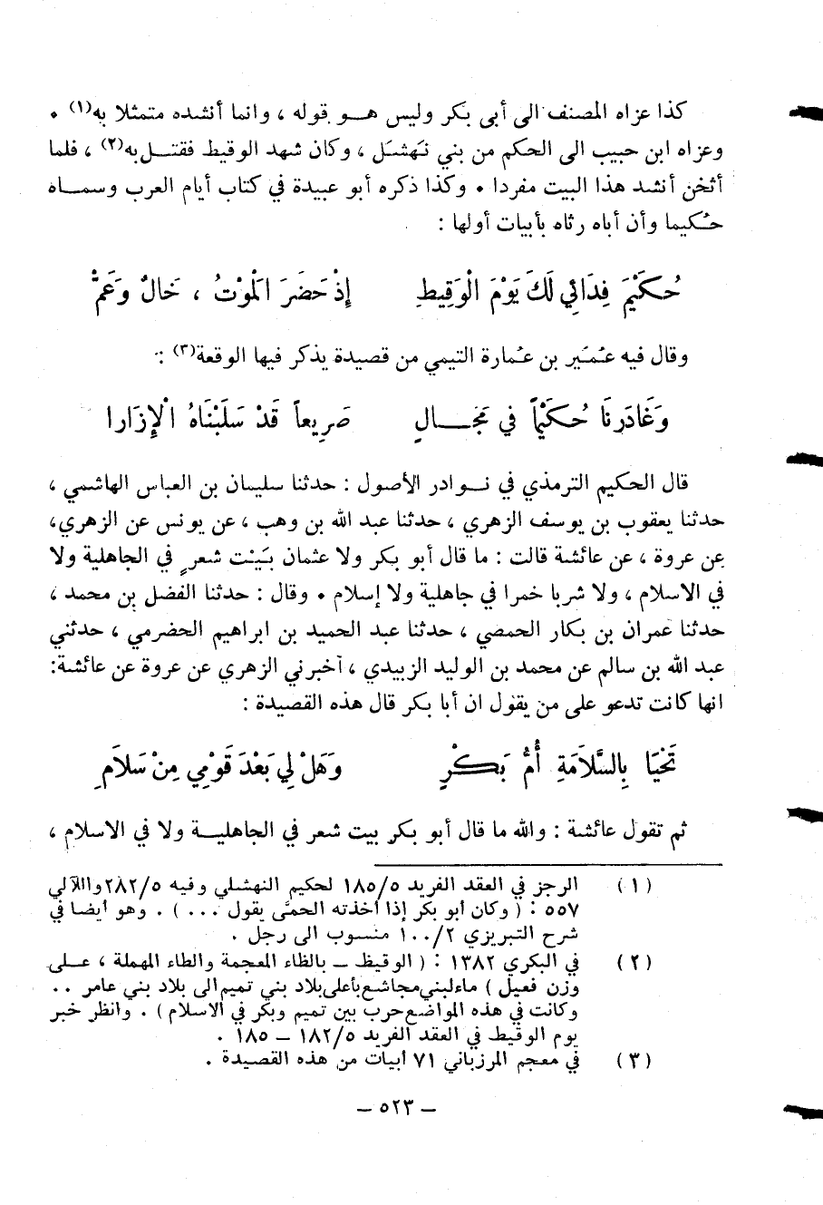 وعزاه ابن حبيب الى الحكم من بني نهشل، وكان شهد الوقيط فقتل به (¬2)، فلما أثخن أنشد هذا البيت مفردا. وكذا ذكره أبو عبيدة في كتاب أيام العرب وسماه حكيما وأن أباه رثاه بأبيات أولها: