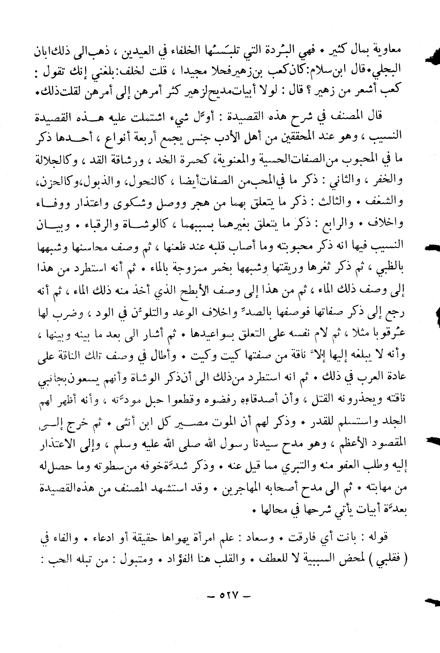 قال المصنف في شرح هذه القصيدة: أوّل شيء اشتملت عليه هذه القصيدة النسيب، وهو عند المحققين من أهل الأدب جنس يجمع أربعة أنواع، أحدها ذكر ما في المحبوب من الصفات الحسية والمعنوية، كحمرة الخد، ورشاقة القد، وكالجلالة والخفر، والثاني: ذكر ما في المحب من الصفات أيضا، كالنحول، والذبول، وكالحزن، والشعف. والثالث: ذكر ما يتعلق بهما من هجر ووصل وشكوى واعتذار ووفاء واخلاف. والرابع: ذكر ما يتعلق بغيرهما بسببهما، كالوشاة والرقباء. وبيان النسيب فيها انه ذكر محبوبته وما أصاب قلبه عند ظعنها، ثم وصف محاسنها وشبهها بالظبي، ثم ذكر ثغرها وريقتها وشبهها بخمر ممزوجة بالماء. ثم أنه استطرد من هذا إلى وصف ذلك الماء، ثم من هذا إلى وصف الأبطح الذي أخذ منه ذلك الماء، ثم أنه رجع إلى ذكر صفاتها فوصفها بالصدّ واخلاف الوعد والتلوّن في الود، وضرب لها عرقوبا مثلا، ثم لام نفسه على التعلق بمواعيدها. ثم أشار الى بعد ما بينه وبينها، وأنه لا يبلغه إليها إلّا ناقة من صفتها كيت وكيت. وأطال في وصف تلك الناقة على عادة العرب في ذلك. ثم انه استطرد من ذلك الى أن ذكر الوشاة وأنهم يسعون بجانبي ناقته ويحذرونه القتل، وأن أصدقاءه رفضوه وقطعوا حبل مودّته، وأنه أظهر لهم الجلد واستسلم للقدر. وذكر لهم أن الموت مصير كل ابن أنثى. ثم خرج إلى المقصود الأعظم، وهو مدح سيدنا رسول الله صلّى الله عليه وسلّم، وإلى الاعتذار إليه وطلب العفو منه والتبري مما قيل عنه. وذكر شدّة خوفه من سطوته وما حصل له من مهابته. ثم الى مدح أصحابه المهاجرين. وقد استشهد المصنف من هذه القصيدة بعدّة أبيات يأتي شرحها في محالها.