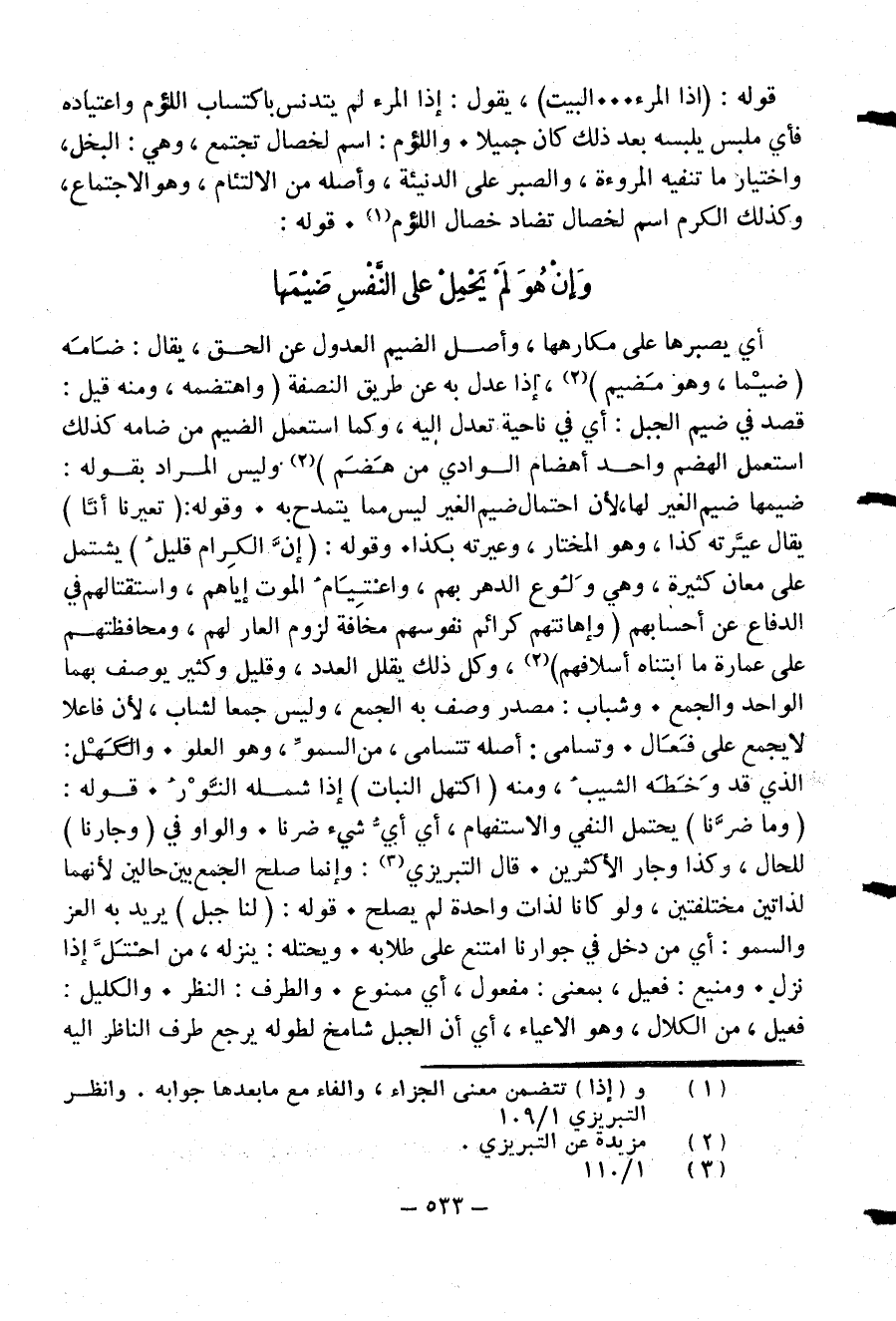 قوله: (اذا المرء ... البيت)، يقول: إذا المرء لم يتدنس باكتساب اللؤم واعتياده فأي ملبس يلبسه بعد ذلك كان جميلا. واللؤم: اسم لخصال تجتمع، وهي: البخل، واختيار ما تنفيه المروءة، والصبر على الدنيئة، وأصله من الالتئام، وهو الاجتماع، وكذلك الكرم اسم لخصال تضاد خصال اللؤم (¬1). قوله: