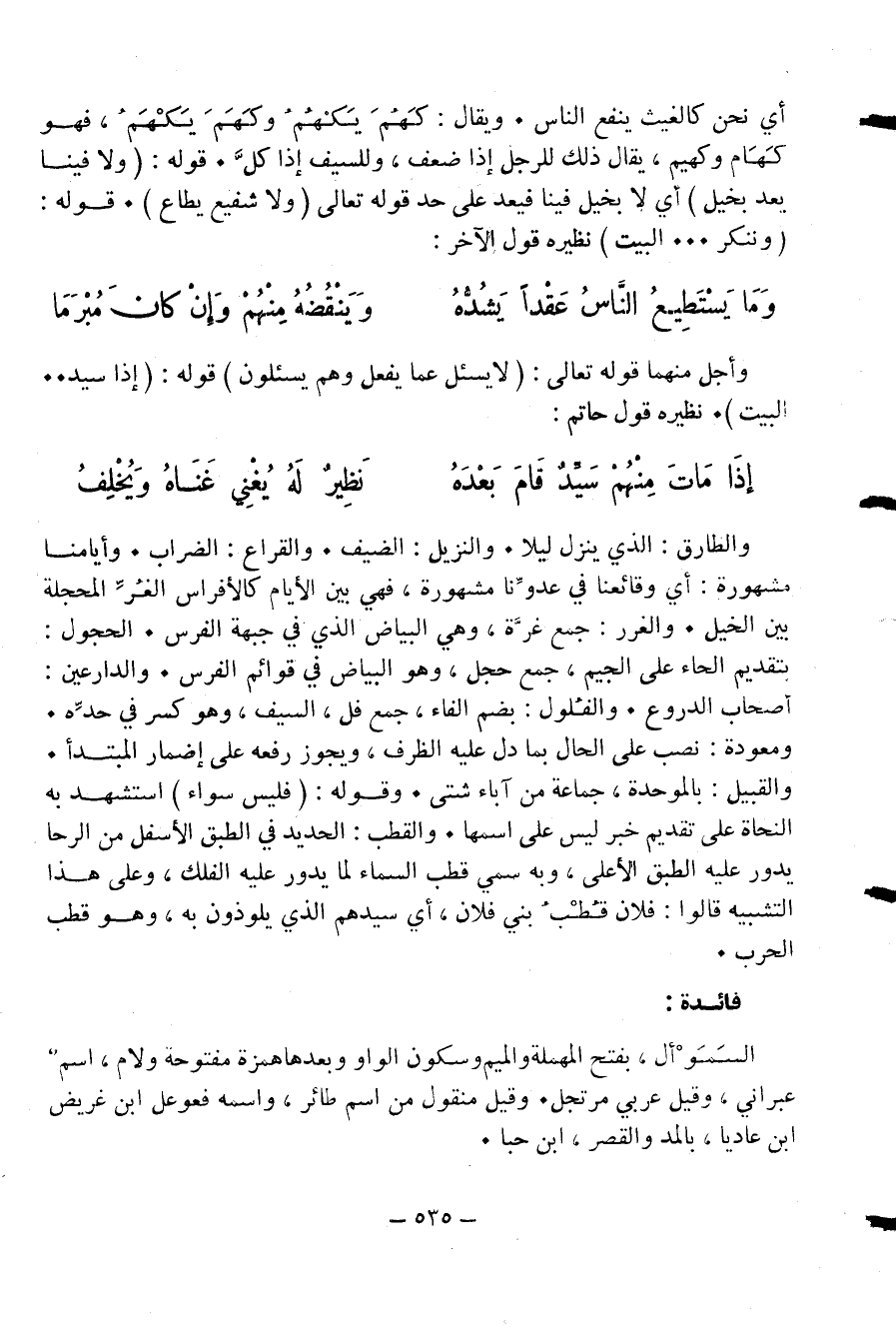 والقبيل: بالموحدة، جماعة من آباء شتى. وقوله: (فليس سواء) استشهد به النحاة على تقديم خبر ليس على اسمها. والقطب: الحديد في الطبق الأسفل من الرحا يدور عليه الطبق الأعلى، وبه سمي قطب السماء لما يدور عليه الفلك، وعلى هذا التشبيه قالوا: فلان قطب بني فلان، أي سيدهم الذي يلوذون به، وهو قطب الحرب.