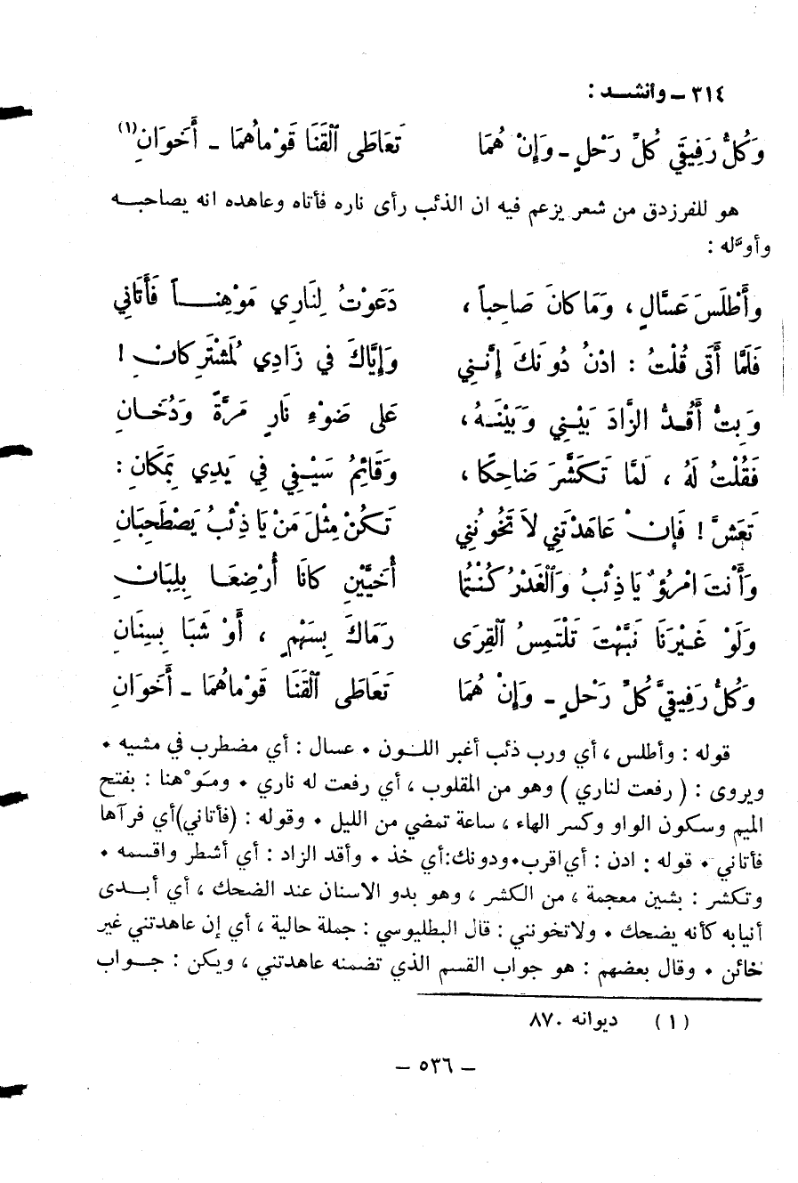 هو للفرزدق من شعر يزعم فيه ان الذئب رأى ناره فأتاه وعاهده انه يصاحبه وأوّله:
