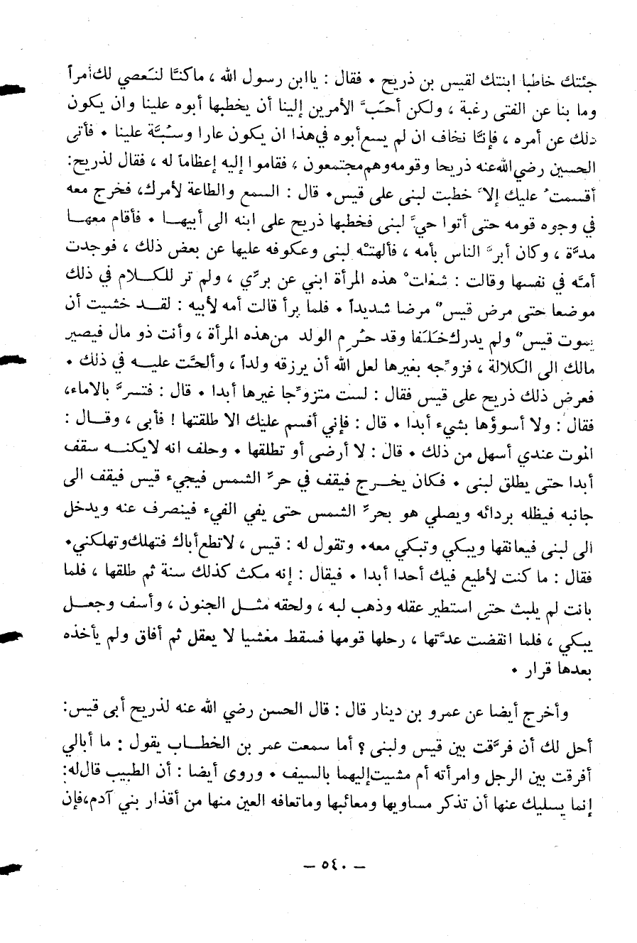 فعرض ذلك ذريح على قيس فقال: لست متزوّجا غيرها أبدا. قال: فتسرّ بالاماء، فقال: ولا أسوؤها بشيء أبدا. قال: فإني أفسم عليك الا طلقتها! فأبى، وقال: