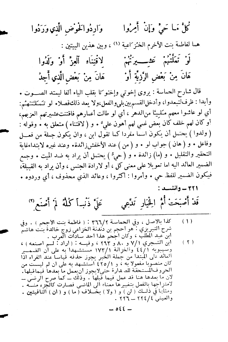 (¬1) كذا بالاصل، وفي الحماسة 2/ 366: (فاطمة بنت الأجحم). وفي شرح التبريزي: هو أحجم بن دندنة الخزاعي زوج خالدة بنت هاشم ابن عبد المطلب، وكان أجحم هذا أحد سادات العرب.