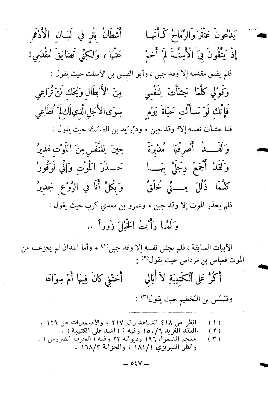 الأبيات السابقة، فلم تجش نفسه إلا وقد جبن (¬1). وأما اللذان لم يجزعا الموت فعباس بن مرداس حيث يقول (¬2):