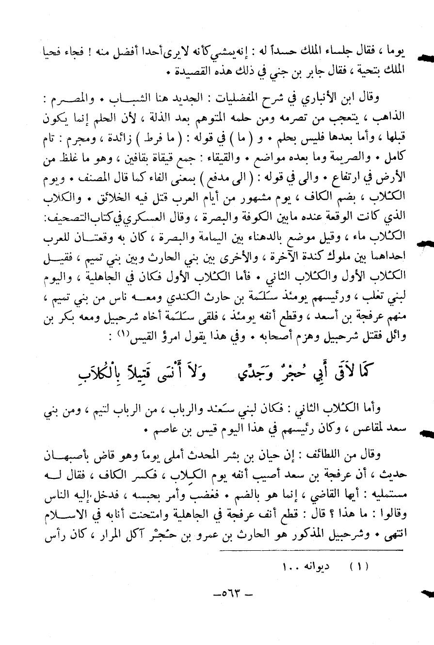 وقال من اللطائف: إن حيان بن بشر المحدث أملى يوما وهو قاض بأصبهان حديث، أن عرفجة بن سعد أصيب أنفه يوم الكلاب، فكسر الكاف، فقال له مستمليه: أيها القاضي، إنما هو بالضم. فغضب وأمر بحبسه، فدخل إليه الناس وقالوا: ما هذا؟ قال: قطع أنف عرفجة في الجاهلية وامتحنت أنابه في الاسلام انتهى. وشرحبيل المذكور هو الحارث بن عمرو بن حجر آكل المرار، كان رأس