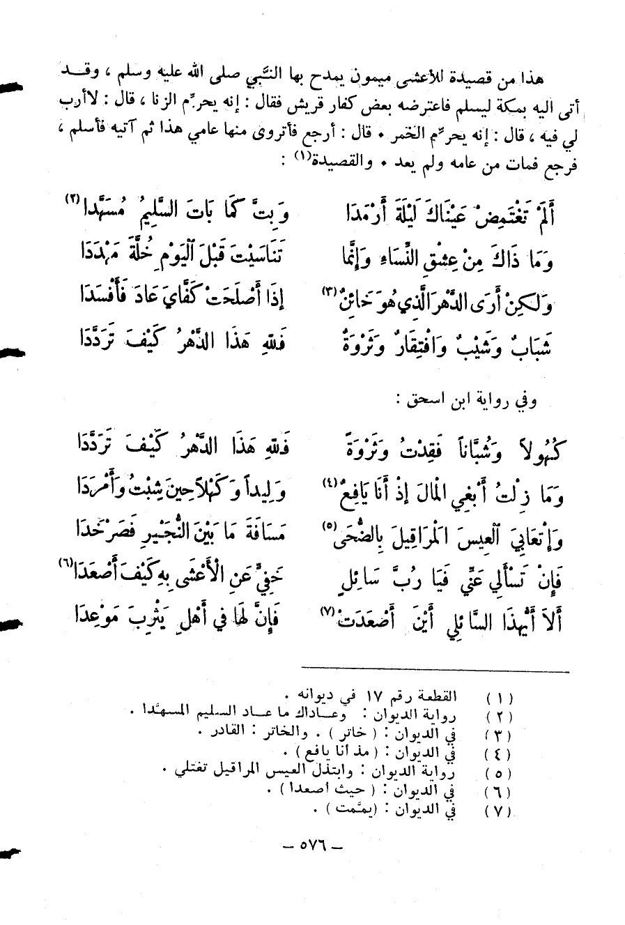 هذا من قصيدة للأعشى ميمون يمدح بها النّبي صلى الله عليه وسلم، وقد أتى اليه بمكة ليسلم فاعترضه بعض كفار قريش فقال: إنه يحرّم الزنا، قال: لا أرب لي فيه، قال: إنه يحرّم الخمر. قال: أرجع فأتروى منها عامي هذا ثم آتيه فأسلم، فرجع فمات من عامه ولم يعد. والقصيدة (¬1):