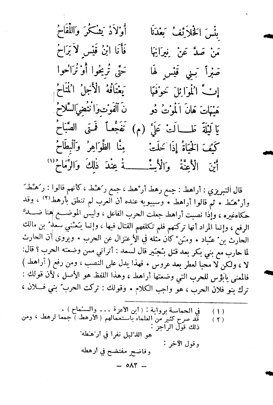 قال التبريزي: أراهط: جمع رهط أرهط، جمع رهط، كأنهم قالوا: رهط وأرهط. ثم قالوا أراهط. وسيبويه عنده أن العرب لم تنطق بأرهط (¬2). وقد حكاه غيره، وإذا نصبت أراهط جعلت الحرب الفاعل، وليس الموضع هنا ضدّ الرفع، وإنما المراد أنها تركتهم فلم تكلفهم القتال فيها، وإنما يعني سعد بن مالك الحارث بن عباد. ومن كان مثله في الأعتزال عن الحرب. ويروى أن الحارث لما حارب مع بني بكر بعد قتل بجير قال لسعد: أتراني ممن وضعته الحرب؟ قال: