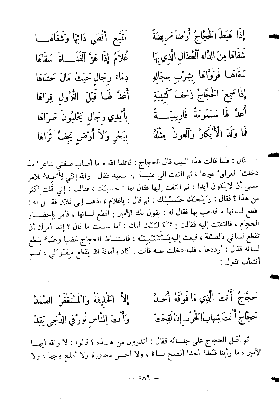 قال: فلما قالت هذا البيت قال الحجاج: قاتلها الله. ما أصاب صفتي شاعر مذ دخلت العراق غيرها، ثم التفت الى عنبسة بن سعيد فقال: والله إنّي لأعدّ للأمر عسى أن لا يكون أبدا، ثم التفت إليها فقال لها: حسبك، فقالت: إني قلت أكثر من هذا؟ فقال: ويحك حسبك: ثم قال: يا غلام، اذهب إلى فلان فقل له: