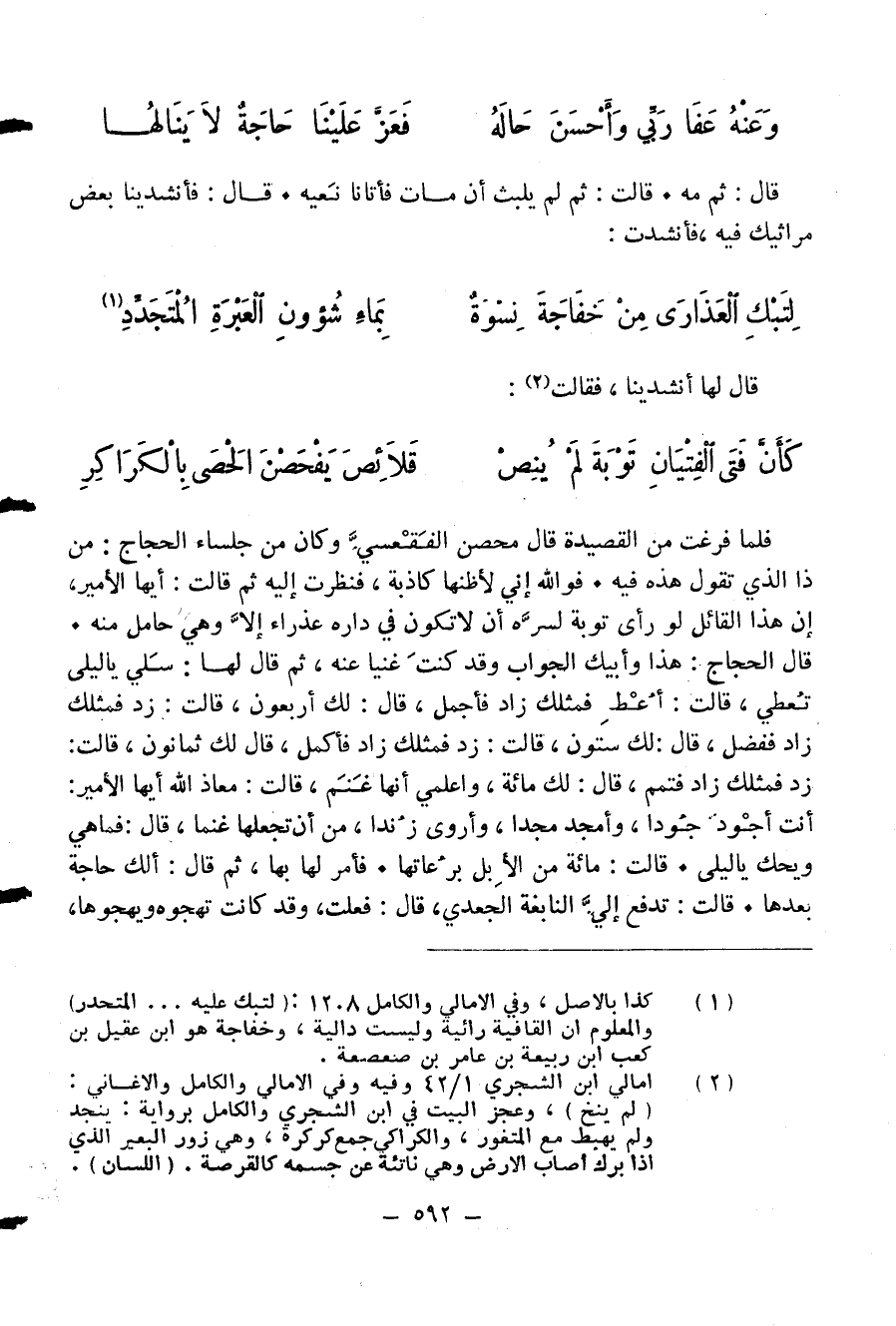 (¬1) كذا بالاصل، وفي الامالي والكامل 1208: (لتبك عليه ... المتحدر) والمعلوم ان القافية رائية وليست دالية، وخفاجة هو ابن عقيل بن كعب ابن ربيعة بن عامر بن صعصعة.