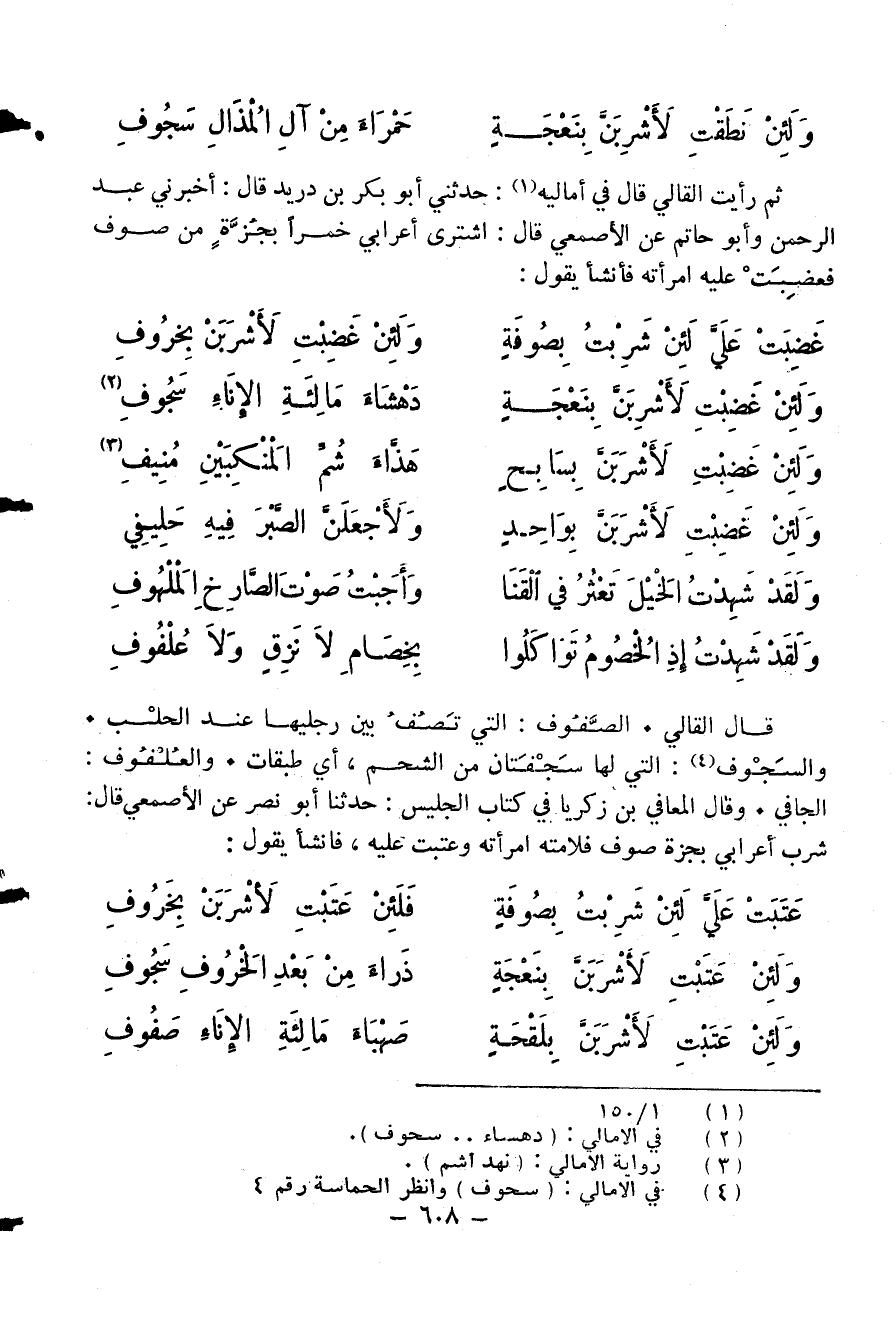 ثم رأيت القالي قال في أماليه (¬1): حدثني أبو بكر بن دريد قال: أخبرني عبد الرحمن وأبو حاتم عن الأصمعي قال: اشترى أعرابي خمرا بجزّة من صوف فعضبت عليه امرأته فأنشأ يقول: