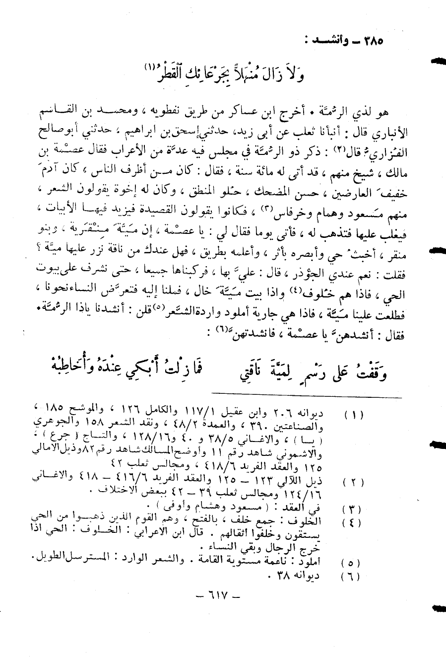 هو لذي الرّمّة. أخرج ابن عساكر من طريق نفطويه، ومحمد بن القاسم الأنباري قال: أنبأنا ثعلب عن أبى زيد، حدثني إسحق بن ابراهيم، حدثني أبو صالح الفزاريّ قال (¬2): ذكر ذو الرّمّة في مجلس فيه عدّة من الأعراب فقال عصمة بن مالك، شيخ منهم، قد أتى له مائة سنة، فقال: كان من أظرف الناس، كان آدم خفيف العارضين، حسن المضحك، حلو المنطق، وكان له إخوة يقولون الشعر، منهم مسعود وهمام وخرفاس (¬3)، فكانوا يقولون القصيدة فيزيد فيها الأبيات، فيغلب عليها فتذهب له، فأتى يوما فقال لي: يا عصمة، إن ميّة منقرية، وبنو منقر، أخبث حي وأبصره بأثر، وأعلمه بطريق، فهل عندك من ناقة نزر عليها ميّة؟