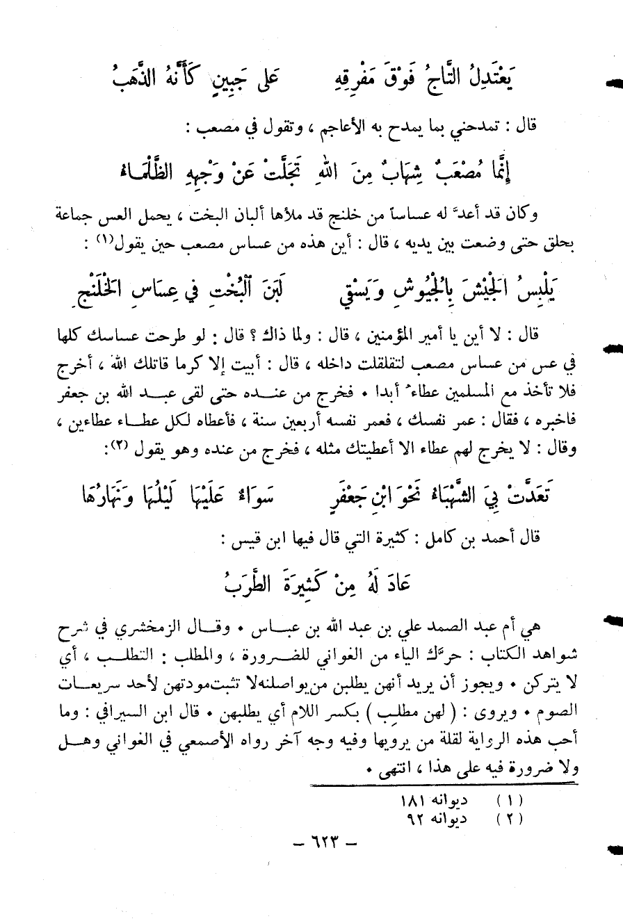 وكان قد أعدّ له عساسا من خلنج قد ملأها ألبان البخت، يحمل العمل جماعة بحلق حتى وضعت بين يديه، قال: أين هذه من عساس مصعب حين يقول (¬1):
