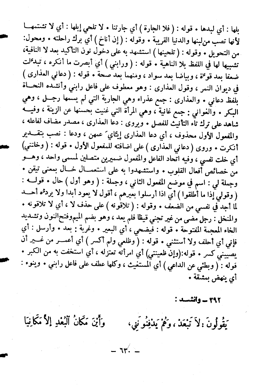 من التحويل. وقوله: (تلحينها) استشهد به على دخول نون التأكيد بعد لا النافية، تشبيها لها في اللفظ بلا الناهية. قوله: (ورابني) أي أبصرت ما أنكره، تبدّلت ضعفا بعد قوّة، وبياضا بعد سواد، ومنهما بعد صحة. قوله: (دعاني العذارى) في ديوان النمر، وقول العذارى: وهو معطوف على فاعل رابني وأنشده النحاة بلفظ دعاني. والعذارى: جمع عذراء وهي الجارية التي لم يسمها رجل، وهي البكر. والغواني: جمع غانية، وهي المرأة التي غنيت بحسنها عن الزينة، وفيه شاهد على ترك تاء التأنيث للفصل. ويروى: دعا العذارى، مصدر مضاف لفاعله، والمفعول الأول محذوف، أي دعا العذارى إيّاي عمهن، ودعا: نصب بتقدير أنكرت. وروى (دعاني العذارى) على اضافته للمفعول الأول. قوله: (وخلتني) أي خلت نفسي، وفيه اتحاد الفاعل والمفعول ضميرين متصلين لمسمى واحد، وهو من خصائص أفعال القلوب. واستشهدوا به على استعمال خال بمعنى تيقن.
