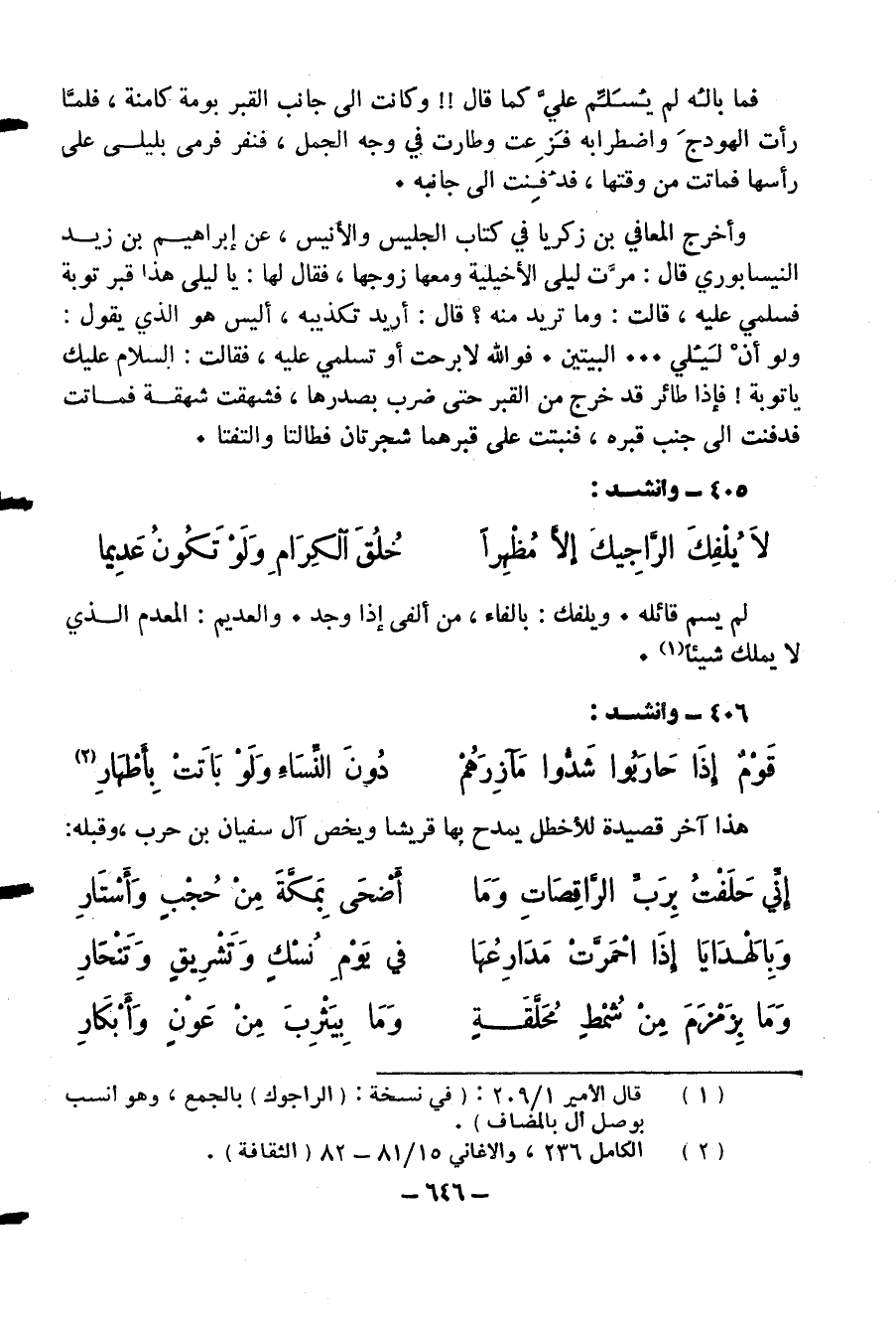 وأخرج المعافي بن زكريا في كتاب الجليس والأنيس، عن إبراهيم بن زيد النيسابوري قال: مرّت ليلى الأخيلية ومعها زوجها، فقال لها: يا ليلى هذا قبر توبة فسلمي عليه، قالت: وما تريد منه؟ قال: أريد تكذيبه، أليس هو الذي يقول: