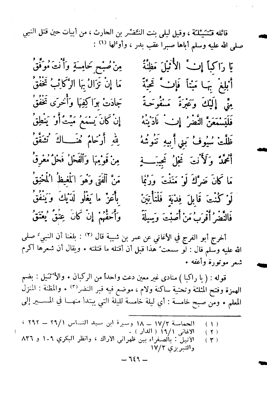 قوله: (يا راكبا) منادى غير معين دعت واحدا من الركبان. والأثيل: بضم الهمزة وفتح المثلثة وتحتية ساكنة ولام، موضع فيه قبر النضر (¬3). والمظنة: المنزل المعلم. ومن صبح خامسة: أي ليلة خامسة لليلة التي يبتدأ منها في المسير إلى