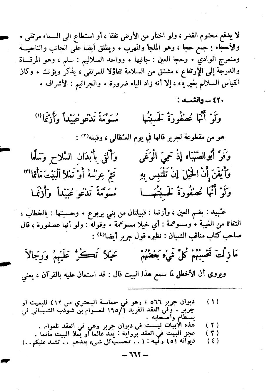 (¬1) ديوان جرير 566، وهو في حماسة البحتري ص 412 للبعيث أو جرير. وفي العقد الفريد 1/ 195 للعوام بن شوذب الشيباني في بسطام وأصحابه.