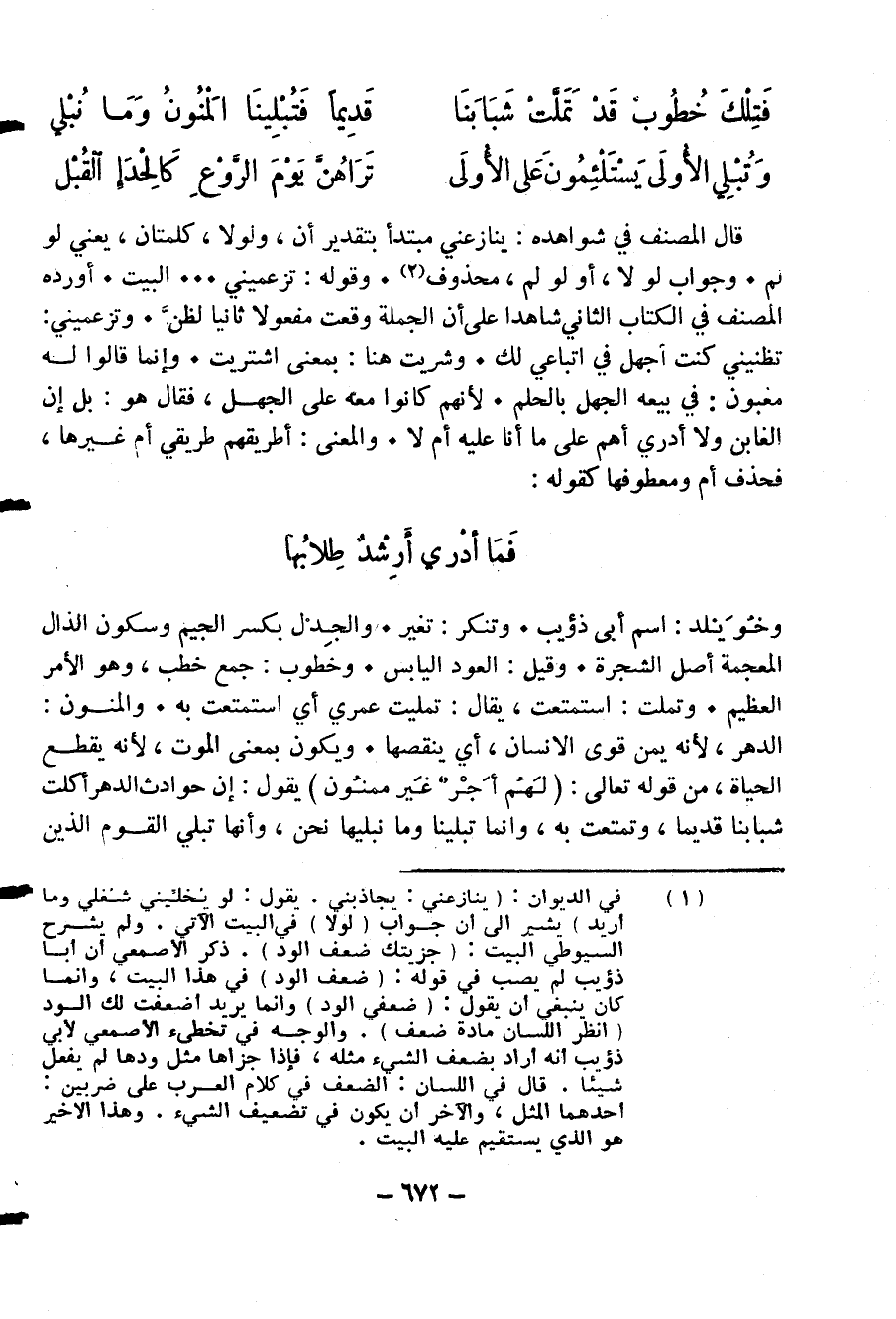 (¬1) في الديوان: (ينازعني: يجاذبني. يقول: لو يخلّيني شغلي وما أريد يشير الى ان جواب (لولا) في البيت الآتي. ولم يشرح السيوطى البيت: (جزيتك ضعف الود). ذكر الأصمعي ان ابا ذؤيب لم يصب في قوله: (ضعف الود) في هذا البيت. وانما كان ينبغى ان يقول: (ضعفي الود) وانما يريد أضعفت لك الود (انظر اللسان مادة ضعف). والوجه في تخطئ الأصمعي لأبي ذؤيب انه اراد بضعف الشيء مثله. فإذا جزاها مثل ودها لم يفعل شيئا. قال في اللسان: الضعف في كلام العرب على ضربين: