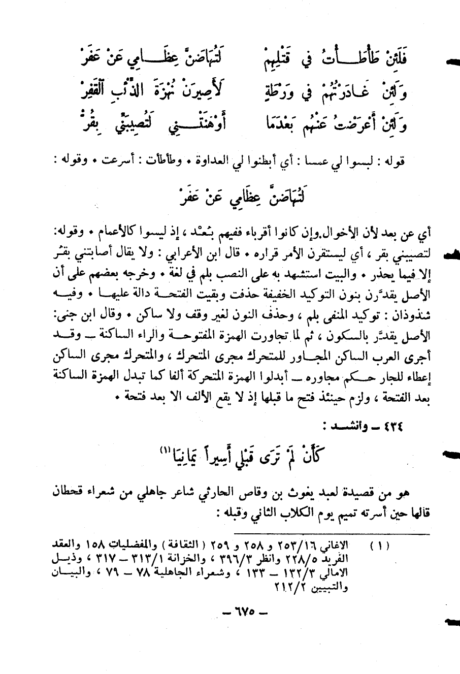 أي عن بعد لأن الأخوال وإن كانوا أقرباء ففيهم بعد، إذ ليسوا كالأعمام. وقوله لتصيبني بقر، أي ليستقرن الأمر قراره. قال ابن الأعرابي: ولا يقال أصابتني بقر إلا فيما يحذر. والبيت استشهد به على النصب بلم في لغة. وخرجه بعضهم على أن الأصل يقدّرن بنون التوكيد الخفيفة حذفت وبقيت الفتحة دالة عليها. وفيه شذوذان: توكيد المنفى بلم، وحذف النون لغير وقف ولا ساكن. وقال ابن جنى: