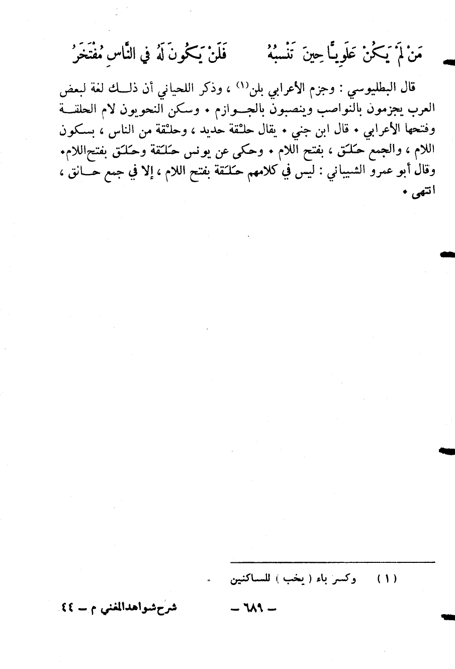 قال البطليوسي: وجزم الأعرابي بلن (¬1)، وذكر اللحياني أن ذلك لغة لبعض العرب يجزمون بالنواصب وينصبون بالجوازم. وسكن النحويون لام الحلقة وفتحها الأعرابي. قال ابن جني. يقال حلقة حديد، وحلقة من الناس، بسكون اللام، والجمع حلق، بفتح اللام. وحكى عن يونس حلقة وحلق بفتح اللام.