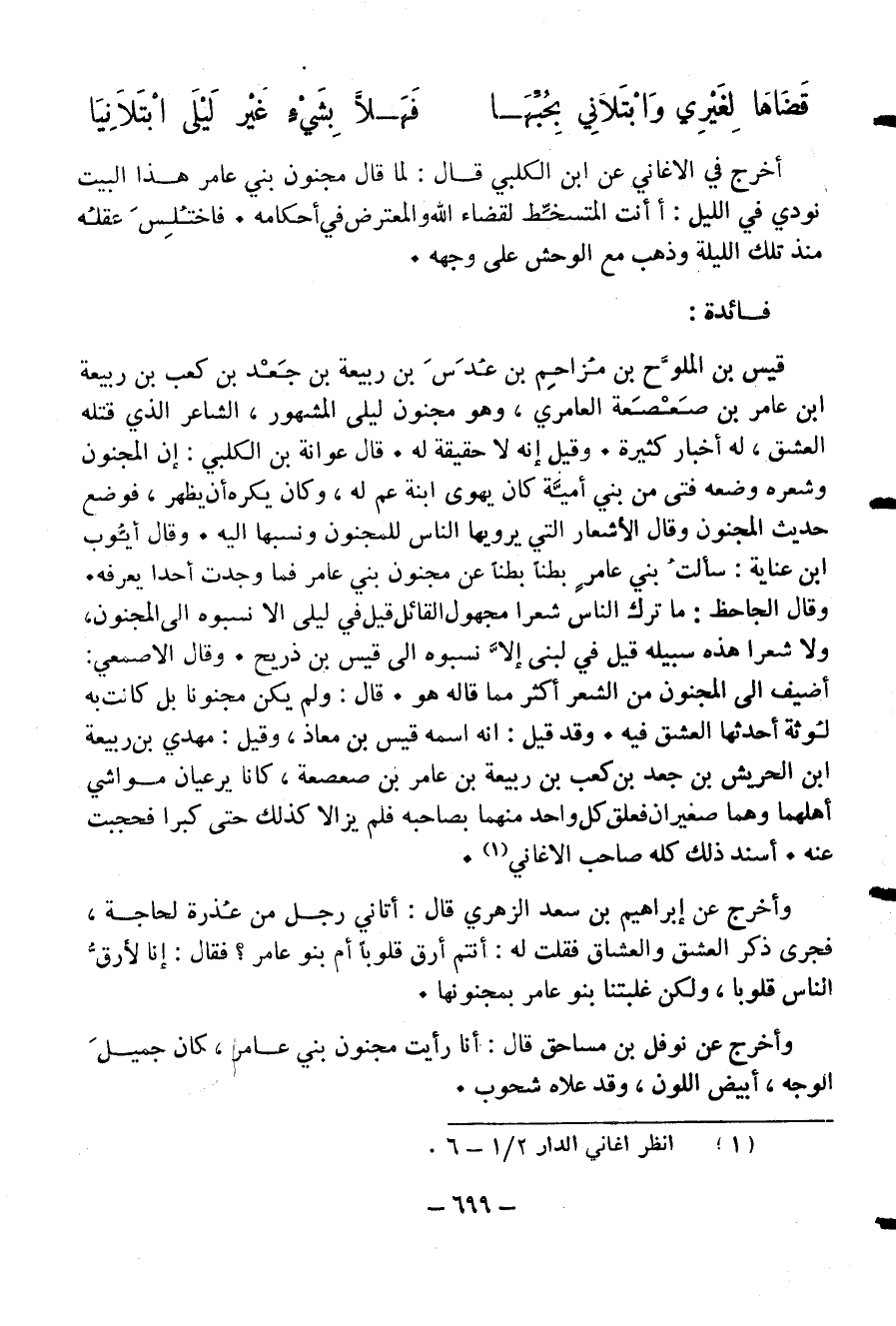 وأخرج عن نوفل بن مساحق قال: أنا رأيت مجنون بني عامر، كان جميل الوجه، أبيض اللون، وقد علاه شحوب.