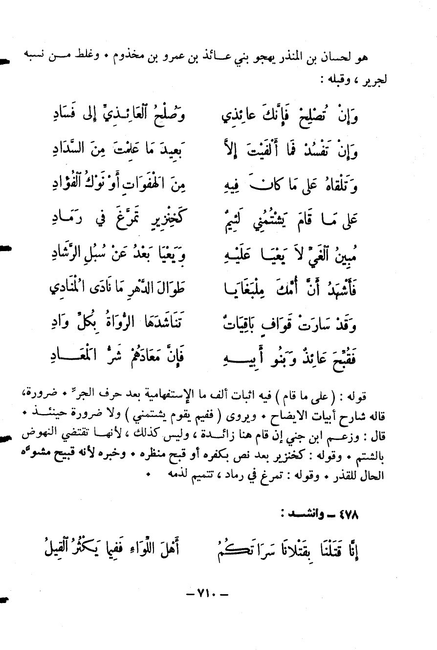 هو لحسان بن المنذر يهجو بني عائذ بن عمرو بن مخذوم. وغلط من نسبه لجرير، وقبله: