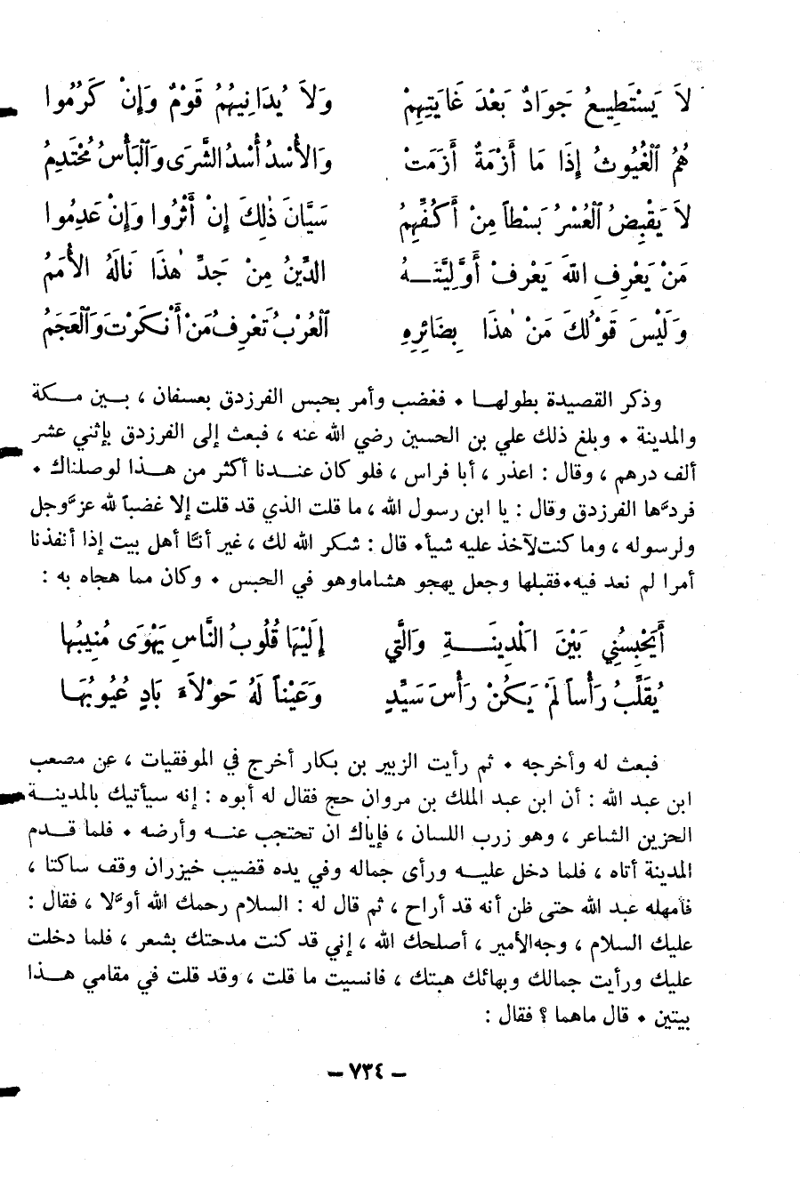 فبعث له وأخرجه. ثم رأيت الزبير بن بكار أخرج في الموفقيات، عن مصعب ابن عبد الله: أن ابن عبد الملك بن مروان حج فقال له أبوه: إنه سيأتيك بالمدينة الحزين الشاعر، وهو زرب اللسان، فإياك ان تحتجب عنه وأرضه. فلما قدم المدينة أتاه، فلما دخل عليه ورأى جماله وفي يده قضيب خيزران وقف ساكتا، فامهله عبد الله حتى ظن أنه قد أراح، ثم قال له: السلام رحمك الله أوّلا، فقال: