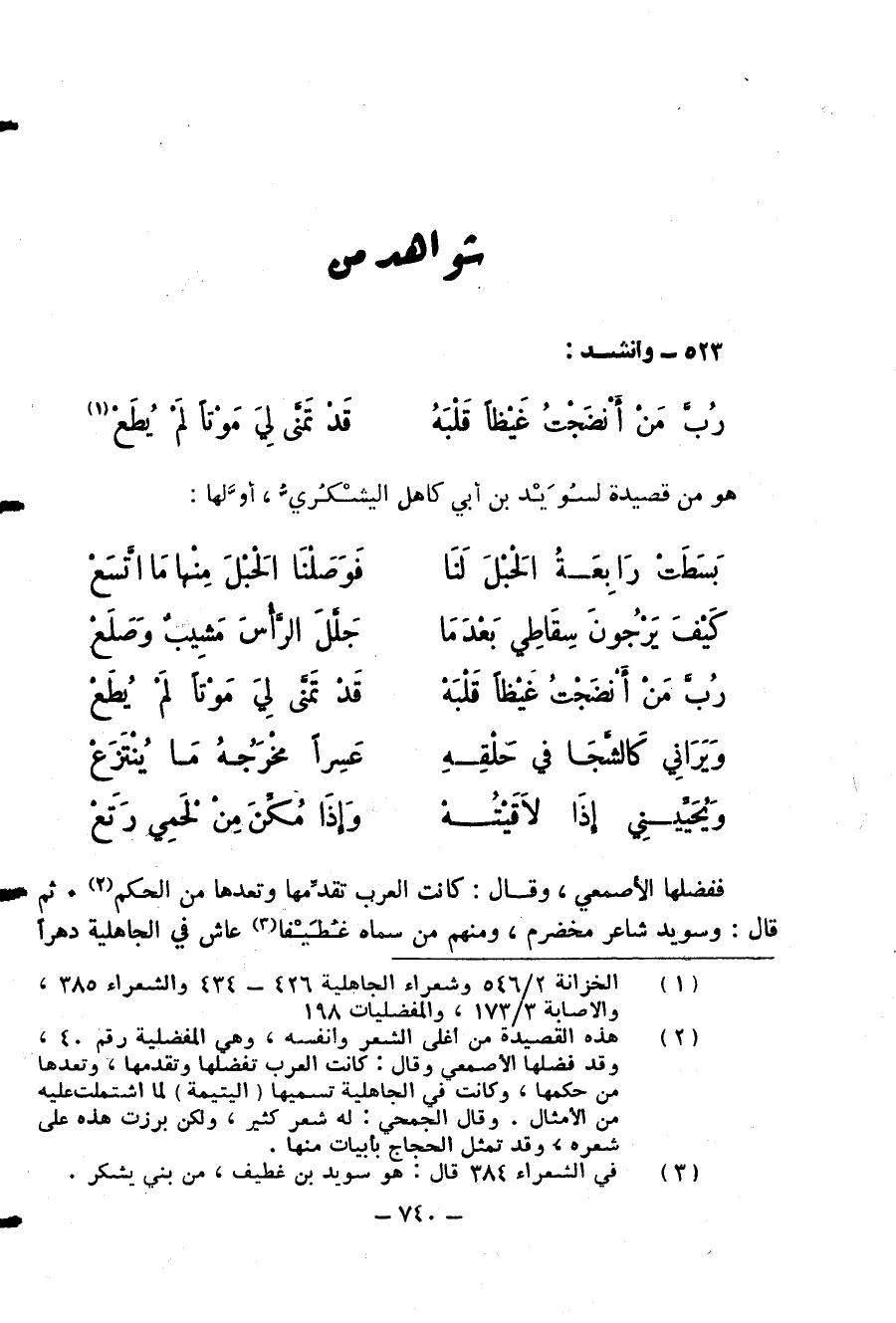 (¬2) هذه القصيدة من أغلى الشعر وأنفسه. وهي المفضلية رقم 40، وقد فضلها الأصمعي وقال: كانت العرب تفضلها وتقدمها، وتعدها من حكمها. وكانت في الجاهلية تسميها (اليتيمة) لما اشتملت عليه من الأمثال. وقال الجمحي: له شعر كثير، ولكن برزت هذه على شعره، وقد تمثل الحجاج بأبيات منها.