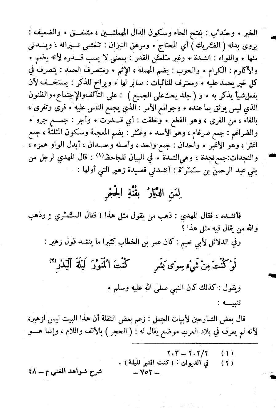 قال بعض الشارحين لأبيات الجمل: زعم بعض النقلة أن هذا البيت ليس لزهير، لأنه لم يعرف في بلاد العرب موضع يقال له: (الحجر) بالألف واللام، وإنما هو
