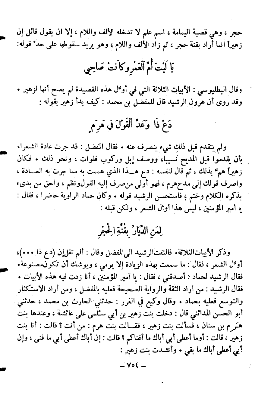 ولم يتقدم قبل ذلك شيء ينصرف عنه. فقال المفضل: قد جرت عادة الشعراء بأن يقدموا قبل المديح نسيبا، ووصف إبل وركوب فلوات، ونحو ذلك. فكان زهيرا همّ بذلك، ثم قال لنفسه: دع هذا الذي هممت به مما جرت به العادة، واصرف قولك إلى مدح هرم، فهو أولى من صرف إليه القول ونظم، وأحق من بدئ بذكره الكلام وختم؛ فاستحسن الرشيد قوله. وكان حماد الراوية حاضرا، فقال: