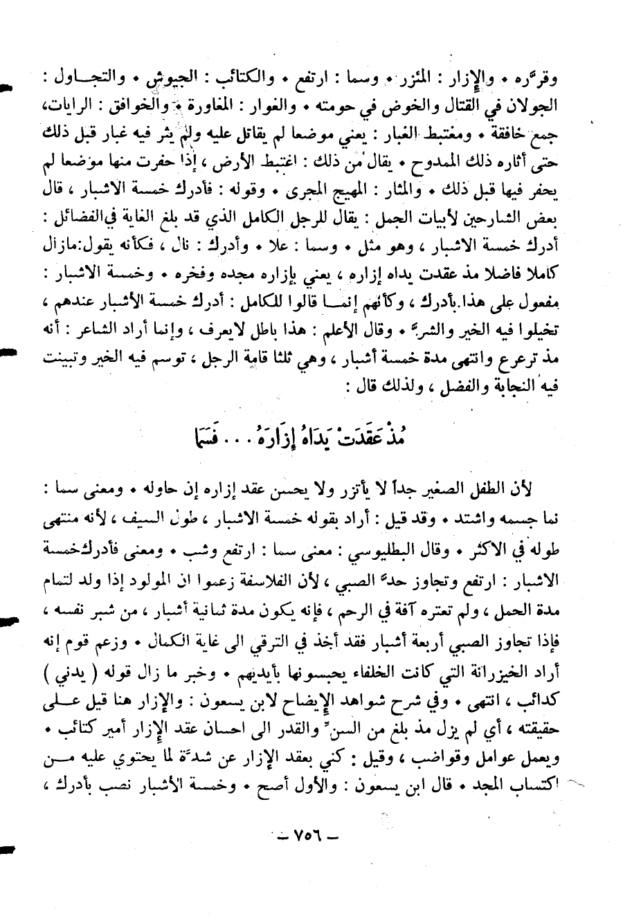ويعمل عوامل وقواضب، وقيل: كني بعقد الإزار عن شدّة لما يحتوي عليه من اكتساب المجد. قال ابن يسعون: والأول أصح. وخمسة الأشبار نصب بأدرك،