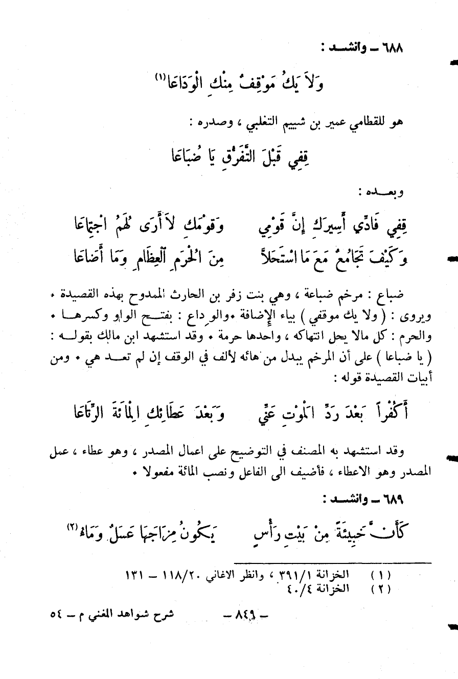 (يا ضباعا) على أن المرخم يبدل من هائه لألف في الوقف إن لم تعد هي. ومن أبيات القصيدة قوله: