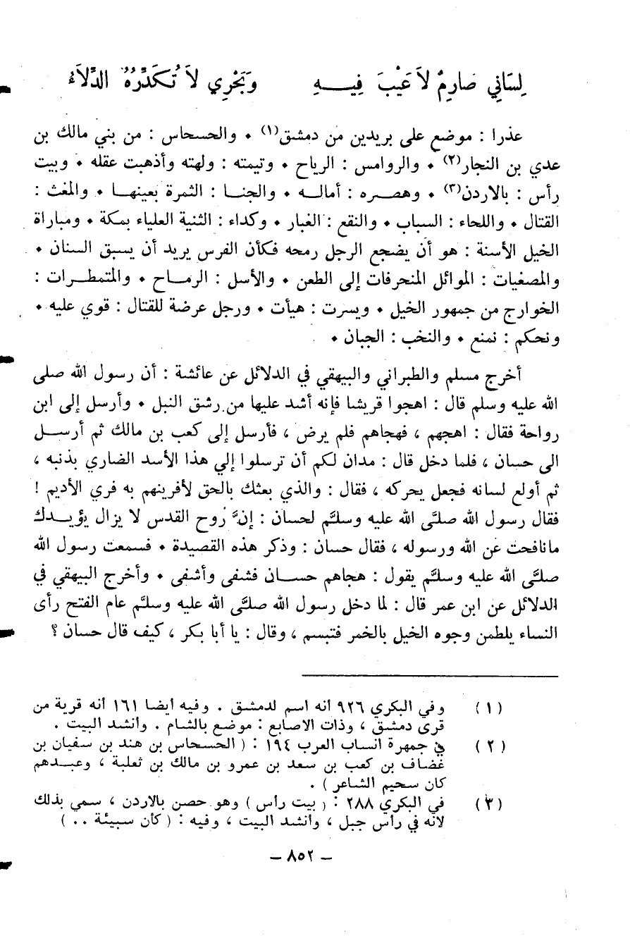 يزال يؤيدك ما نافحت عن الله ورسوله، فقال حسان: وذكر هذه القصيدة. فسمعت رسول الله صلّى الله عليه وسلّم يقول: هجاهم حسان فشفى وأشفى. وأخرج البيهقي في الدلائل عن ابن عمر قال: لما دخل رسول الله صلّى الله عليه وسلّم عام الفتح رأى النساء يلطمن وجوه الخيل بالخمر فتبسم، وقال: يا أبا بكر، كيف قال حسان؟