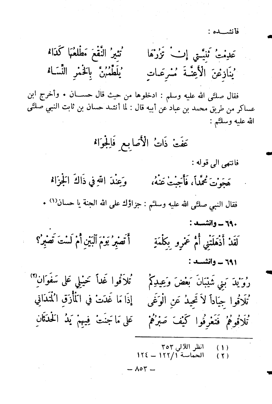 فقال صلّى الله عليه وسلم: ادخلوها من حيث قال حسان. وأخرج ابن عساكر من طريق محمد بن عباد عن أبيه قال: لما أنشد حسان بن ثابت النبي صلّى الله عليه وسلّم:
