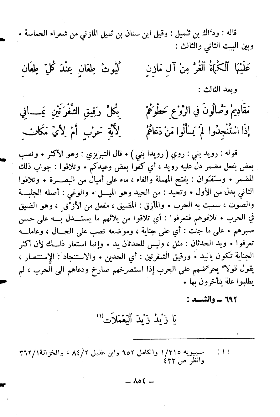قوله: رويد بني: روي (رويدا بني). قال التبريزي: وهو الأكثر. ونصب بعض بفعل مضمر دل عليه رويد، أي كفوا بعض وعيدكم. وتلاقوا: جواب ذلك المضمر. وسفوان: بفتح المهملة والفاء، ماء على أميال من البصرة. وتلاقوا الثاني بدل من الأول. وتحيد: من الحيد وهو الميل. والوغي: أصله الجلبة والصوت، سميت به الحرب. والمأزق: المضيق، مفعل من الأزق، وهو الضيق في الحرب. تلاقوهم فتعرفوا: أي تلاقوا من بلائهم ما يستدل به على حسن صبرهم. على ما جنت: أي على جناية، وموضعه نصب على الحال، وعامله تعرفوا. ويد الحدثان: مثل، وليس للحدثان يد. وإنما استعار ذلك لأن أكثر الجناية تكون باليد. ورقيق الشفرتين: أي الحدين. والاستنجاد: الإستنصار، يقول قولا يحرّضهم على الحرب إذا استصرخهم صارخ ودعاهم الى الحرب، لم يطلبوا علة يتأخرون بها.