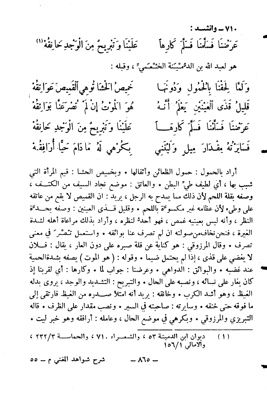 أراد بالحمول: حمول الظعائن وأثقالها. وبخميص الحشا: قيم المرأة التي شبب بها، أي لطيف طيّ البطن. والعاتق: موضع نجاد السيف من الكتف، وصفه بقلة اللحم لأن ذلك مما يمدح به الرجل، يريد: ان القميص لا يقع من عاتقه على وطئ لأن عظامه غير مكسوّة باللحم. وقليل قذى العينين: وصفه بحدّة النظر، وأنه ليس بعينيه غمص، فهو أحدّ لنظره، وأراد بذلك مراعاة أهله لشدة الغيرة، فنحن نخاف من صولته ان لم تصرف عنا بوائقه. واستعمل تصر في معنى تصرف. وقال المرزوقي: هو كناية عن قلة صبره على دون العار، يقال: فلان لا يغضي على قذى، إذا لم يحتمل ضيما. وقوله: (هو الموت) يصفه بشدة الحمية عند غضبه. والبوائق: الدواهي. وعرضنا: جواب لما. وكارها: أي لقربنا إذ كان يغار على نسائه، ونصبه على الحال. والتبريح: التشديد والوجد، يروى بدله الغيظ، وهو أشد الكرب. وخانقه: يريد أنه امتلأ صدره من الغيظ فارتقى إلى ما فوقه حتى خنقه. وسايرته: صاحبته في السير. ونصب مقدار على الظرف. قاله التبريزي والمرزوقي. وبكر هي في موضع الحال، وعامله: أرافقه وهو خبر ليت.