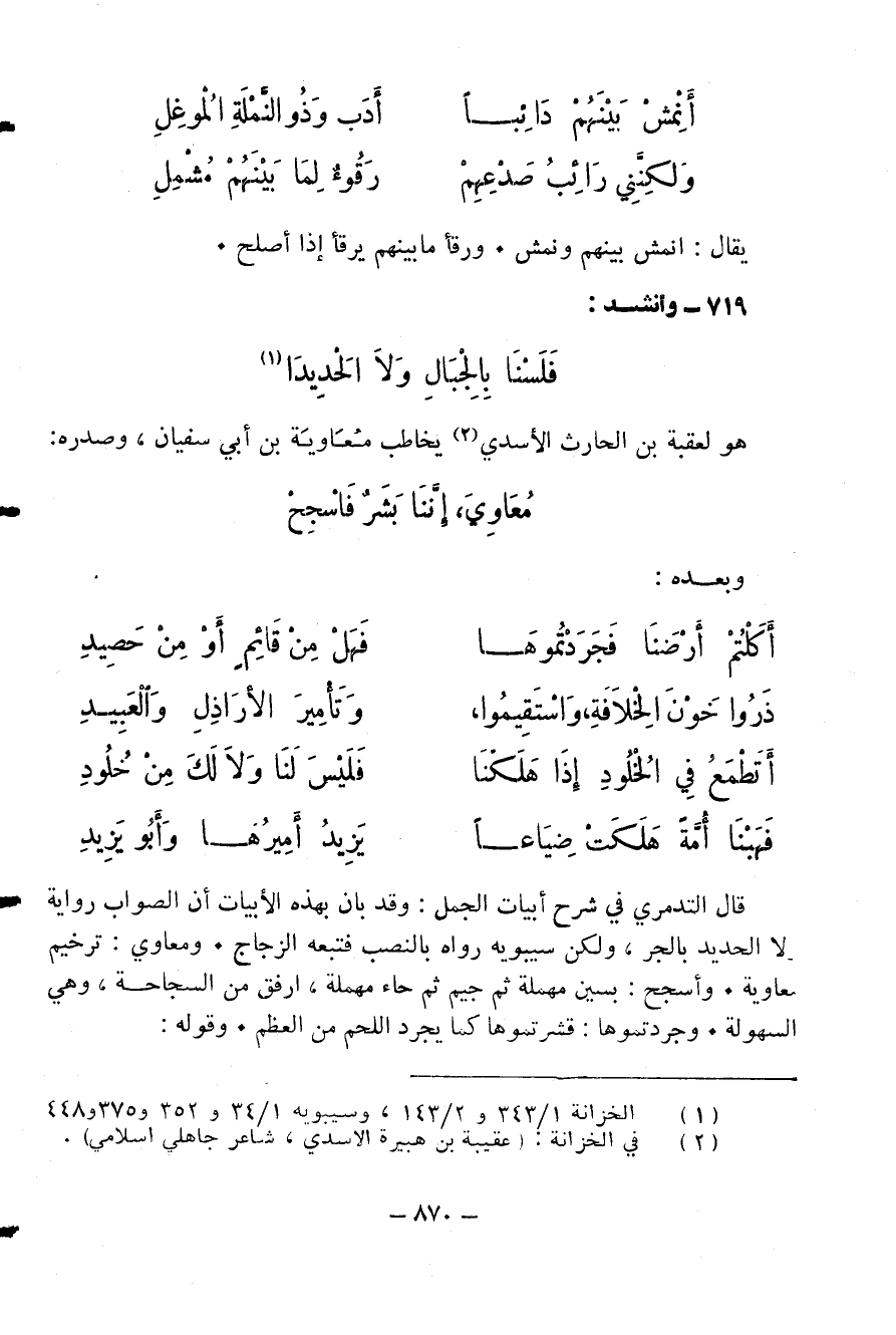 قال التدمري في شرح أبيات الجمل: وقد بان بهذه الأبيات أن الصواب رواية ولا الحديد بالجر، ولكن سيبويه رواه بالنصب فتبعه الزجاج. ومعاوي: ترخيم معاوية. وأسجح: بسين مهملة ثم جيم ثم حاء مهملة، ارفق من السجاحة، وهي السهولة. وجردتموها: قشرتموها كما يجرد اللحم من العظم. وقوله: