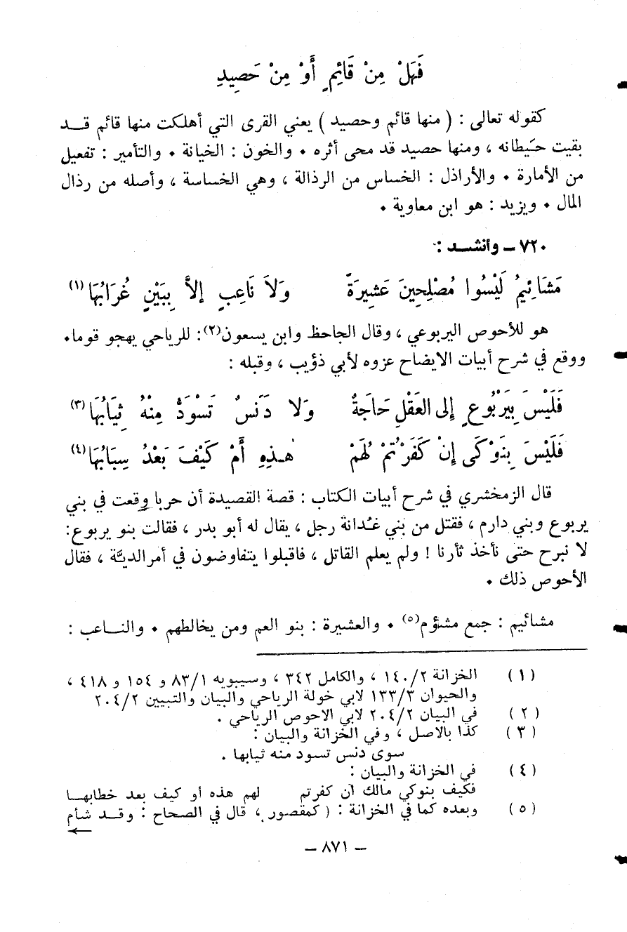 كقوله تعالى: (مِنْها قائِمٌ وَحَصِيدٌ) يعني القرى التي أهلكت منها قائم قد بقيت حيطانه، ومنها حصيد قد محى أثره. والخون: الخيانة. والتأمير: تفعيل من الأمارة. والأراذل: الخساس من الرذالة، وهي الخساسة، وأصله من رذال المال. ويزيد: هو ابن معاوية.